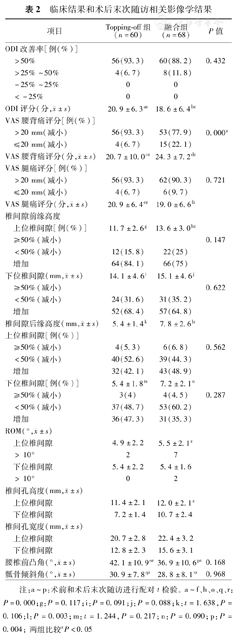 注:a~p:术前和术后末次随访进行配对t检验。a~f、h、o、q、r:P=0.000;g:P=0.117;i:P=0.091;j:P=0.088;k:t=1.638,P=0.106;l:P=0.003;m:t=1.244,P=0.217;n:P=0.090;p:P=0.004;两组比较zP<0.05