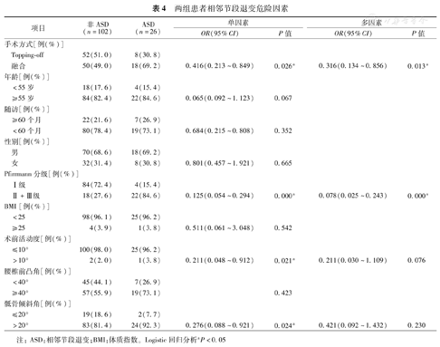 Logistic回归分析证实融合手术、术前椎间盘退变分级严重和长随访是ASD的危险因素。年龄、椎间活动度、椎间孔宽度、椎间盘术前退变分级和不稳程度都和早发性ASD相关。这些结果对以后选择合适的患者Topping-off手术更有指导意义。