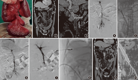 除1例支架植入术后PV/SMV完全通畅(图7),而且考虑到患者7 d前行部分空肠切除术,予以立即拔管之外,7例患者均留置溶栓导管进行持续溶栓治疗,尿激酶用量50万U/d。24 h后造影复查,监测凝血时间,如果血栓完全溶解,则终止溶栓治疗;48 h再次造影复查,所有病例均终止溶栓治疗。终止治疗后拔除溶栓导管及鞘管,鞘管肝内段采用边退导管边进行肝内穿刺通道栓塞,直至肝脏包膜下,其中1例采用明胶海绵条栓塞,其余7例均采用纤毛弹簧圈栓塞(图8)。患者PMT术后1、7 d复查血常规、尿常规和肝肾功能,对比术前及术后白细胞、血红蛋白、丙氨酸转氨酶、天冬氨酸转氨酶、肌酐、尿素氮变化;术后1、6个月行PV/SMV CTA复查(图9,图10),所有患者随访6月,术后口服抗凝治疗至少6个月。