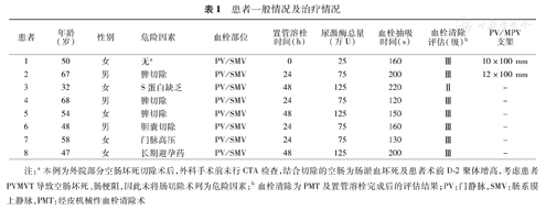 2014年1月至2016年1月南京市第一医院介入科接受介入治疗的8例急性PVMVT患者,发病时间1~12 d,男3例、女5例,年龄32~68岁,中位年龄52岁。1例为肠坏死切除术后(图1),3例为脾切除术后,1例肝硬化脾肿大,1例为胆囊切除术后,1例长期口服避孕药,1例实验室检查明确为S蛋白缺乏。8例患者介入治疗术前实验室检查、彩色多普勒超声及PV/SMV CTA(图2,图3)明确诊断(表1)。