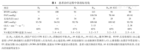 注:D0:入院时;D1:剖宫产术后(CPR术后);D4:药物治疗开始;D10:AS术前;D14:AS术后;D16:撤ECMO前。RVSP:右室收缩压(由心超获得);PAP:肺动脉压(由漂浮导管获得);右室内径:由心超获得;ABP:有创动脉压(由动脉测压管测得);CI:心排指数(由漂浮导管获得);EF:射血分数(由心超获得);ECMO:体外膜肺,流量由ECMO流量显示器获得。患者入院后肺高压明显,AS术后肺动脉压较前有所改善,右室内径较前明显变小