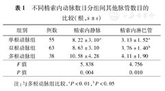 不同精索内动脉数目分组间其他脉管数目的比较(根,