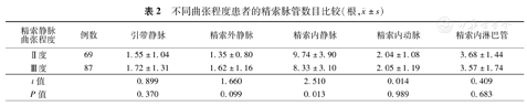 | 精索静脉曲张程度 | 例数 | 引带静脉 | 精索外静脉 | 精索内静脉 | 精索内动脉 | 精索内淋巴管 |
