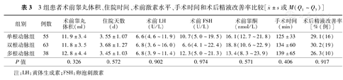 3组患者术前睾丸体积、住院时间、术前激素水平、手术时间和术后精液改善率比较[