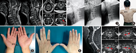CSA是颈椎病的一种特殊类型,发病率低,主要见于男性[2],30~60岁多见(尤其是>50岁),以上肢肌萎缩为主要表现,具有不对称性、局限节段性、稳定自限性等特点[2,3]。早期研究认为CSA多不伴有感觉障碍,而日本学者提出CSA偶可伴有感觉异常,如上肢短暂性或一过性根性症状等[4,5]。本组8例患者合并有上肢疼痛、麻木或一过性的根性症状。"脊髓前角/前根运动损伤学说"是目前CSA主要发病机制,但随着压迫程度、范围的增加,可能累及脊髓前角/前根以外的感觉支配区域,出现肌萎缩以外的神经症状,故"无感觉异常"不能作为诊断CSA的必须条件,更不能单纯以此点与其他类似疾病相鉴别;相反,对于病程长、压迫节段多、程度重的高龄患者容易合并上肢感觉异常,甚至髓性症状。