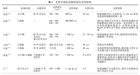 | 小鼠[13] | 2-细胞 | 30 W卤素灯 | 可见光 | 1 600 lux | 30 min | 无光线照射组胚胎孵化、附着能力等生长发育能力高于有光线照射组胚胎 |