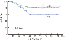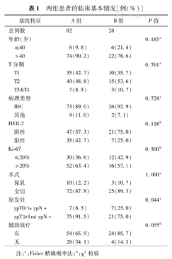 新辅助化疗方案包含蒽环和紫杉两类,其中单方案为4个周期,两方案续贯为6~8个周期。辅助化疗方案均为不同于新辅助治疗方案的单一方案4个周期,包含蒽环、紫杉以及异长春花碱类。药物剂量为:表柔吡星100 mg/m2+环磷酰胺600 mg/m2,d1,q21d×4;紫杉醇80 mg/m2,d1,q7d×12;长春瑞滨25 mg/m2,d1、8,q21d×4。本研究中免疫组化提示HER-2阳性的患者共43例(39.1%),在治疗前均被告知靶向治疗的重要性,但仍由于费用昂贵等原因选择放弃靶向治疗。全部患者在NCT结束之后,进行了包含腋窝淋巴结清扫的乳腺癌根治性手术。术后进行辅助化疗的82例患者(74.5%),定义为A组;28例患者(25.5%)未进行术后化疗,定义为B组。78例(70.9%)患者术后6个月内接受了胸壁及锁骨上淋巴引流区放疗,剂量为50 Gy/25 f;保留乳房手术患者接受全乳及瘤床加量放疗,其中全乳照射剂量为46 Gy/23 f或50 Gy/25 f,瘤床加量剂量为14 Gy/7 f或10 Gy/5 f。