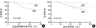 DFS、DDFS、OS的多因素分析见表3。结果显示:A、B两组之间,DFS、DDFS、OS差异均有统计学意义(P<0.05)。在校正了其他相关影响因素后,相对于A组,B组发生远处转移的风险为5.256倍,P=0.033(图2A),死亡风险为7.478倍,P=0.011(图2B)。