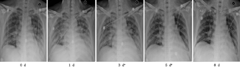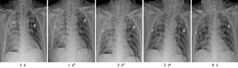 由疾控中心专业人员采样留取两份呼吸道标本(鼻咽分泌物及深部痰)作病毒核酸检测,雾化治疗后1~4 d,4例患者第1次病毒核酸检测转阴,分别间隔24 h以上再次阴性后解除隔离,详见表2。治疗后患者咳嗽、咳痰、胸闷等呼吸道症状及发热等症状逐渐好转,详见表3。呼吸频率、血常规及血气分析均恢复正常,详见表4。复查胸部影像X线检查,肺部原发病灶均逐渐吸收好转,均无新发病灶,详见图1,图2,图3,图4。