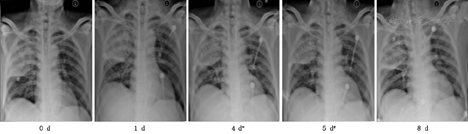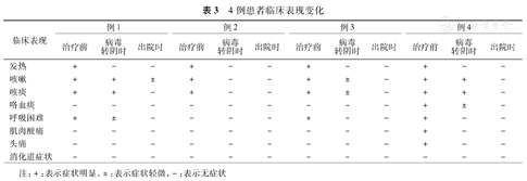 观察4例病例治疗前后疾病转归,包括:临床表现,呼吸道标本病毒核酸检测情况,实验室及影像学X线检查结果,肺部病灶变化。
