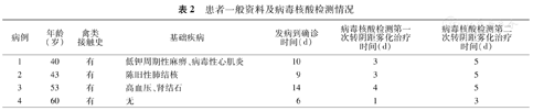 | 病例 | 年龄(岁) | 禽类接触史 | 基础疾病 | 发病到确诊时间(d) | 病毒核酸检测第一次转阴距雾化治疗时间(d) | 病毒核酸检测第二次转阴距雾化治疗时间(d) |
