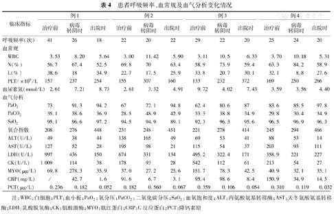 本研究对象均来自黔东南苗族侗族自治州人民医院2017年3月6日至4月12日期间住院患者,治疗前报请院相关部门批准并征得患者知情同意。4例患者均为男性,平均年龄49岁,诊断均符合国家卫计委《人感染H7N9禽流感诊疗方案2017年第一版》标准[6],发病前均有禽类接触史,采集其呼吸道分泌物H7N9病毒核酸检测结果为阳性,并由省疾控中心复核确诊,起病时均伴发热、咳嗽、咳痰、畏寒、全身乏力等症状,其中3例患者合并低钾周期性麻痹、陈旧性肺结核、高血压、肾结石等基础疾病,胸部影像学检查提示均合并肺部炎症性病变,其中病例1为重症患者。