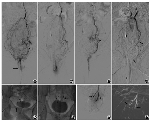所有患者术前均经结肠镜、肛门指检、电子肛直肠镜、心电图、出凝血和血常规等检查,用开塞露进行肠道准备,电子肛直肠镜采集齿线处,以及上下0.5~1.0 cm处肛管图像。将一枚5号带套注射针头塞入肛管作为定位标记。右腹股沟皮肤消毒局麻后,采用Seldinger改良法穿刺股动脉,成功后置入导管鞘。5 F Rh导管插入并经股动脉上行,至主动脉分叉上方4 cm左右后,在约平第3腰椎高度腹主动脉前壁确定肠系膜下动脉开口,序贯的进入导丝、2.8 F超细导管,下行至第3骶椎水平附近时进入SRA,充分造影了解分支情况以及平耻骨联合附近的动脉染色分布,通常在定位针头周围的上2/3区域会见到迂曲、增粗血管和团状浓密染色影(图1)。在导丝导引下超选进入左侧分支近浓密染色区,将栓塞剂注入,弹簧圈在屏幕上可以看到(图2),注射颗粒或液体栓塞剂时可混合少量对比剂以便掌握栓塞进度,观察到目标血管血流缓慢并接近停滞,直至痔区血管床不显影。达到满意栓塞程度后退回导管至上一级分支处用造影剂证实栓塞范围内供血动脉已阻断不显影,单侧栓塞成功。对侧栓塞方法相同,栓塞完毕后造影确认右侧痔区动脉已被栓塞(图1D)。撤除所有导管,拔出导管鞘,按压穿刺部位20 min,绷带加压包扎后送回病房。