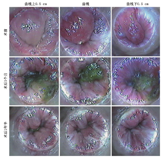 术后随访最长22个月,2例1个月后有少量便血,外用中成药治疗后症状消失无再发作,1例1个月后有痔核脱出,可自行回纳,其余无复发症状。所有患者术后1 d、1个月、3个月、6个月和1年用电子肛门镜在齿线以及上下0.5~1.0 cm处采集图像,术前、术后对照显示出血、黏膜充血和痔核脱出基本治愈(图3),生活质量显著提高。
