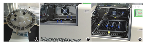 全部菌株均采用SDA平板28 ℃静置培养,根据不同菌株的生长速度培养时间为3~10 d不等。待培养出成熟孢子后进行乳酸酚棉兰染色后显微镜下再次观察菌株,以确认留取菌株鉴定无误后进行后续质谱鉴定。同时按照仪器操作要求转种2管液体沙保弱培养基,分别于28 ℃旋转培养仪120次/min垂直旋转培养和本实验室自行研发的恒温空气摇床28 ℃ 120次/min水平震荡培养,直至生长出足够多的菌丝为止。培养时间为1~7 d,以观察哪种培养基和培养方式、培养时间更适合质谱鉴定。垂直旋转培养方式、空气摇床和水平震荡培养方式如图1,图2,图3所示:传统的空气摇床是把培养管直接插入图2摇床的插孔中震荡;水平震荡培养是在摇床的插孔上方放入1个托盘,将托盘四周固定,震荡方向就由原来的垂直震荡变成水平震荡。