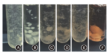 SDA上菌落生长较慢,产孢量较多;垂直旋转培养方式生长较慢,菌落容易缠绕成团;水平震荡培养方式生长较快,菌落颗粒细密;见图5,图6,图7。