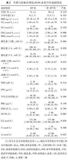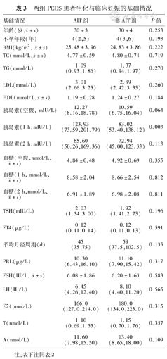PCOS是复杂的内分泌紊乱及代谢紊乱性疾病,容易发生早期妊娠丢失,经研究发现30%~50%的PCOS患者可发生早期妊娠丢失,而非PCOS患者发生妊娠丢失的概率为10%~15%[8,9]。目前对于引起PCOS患者增高的不良妊娠结局的具体机制仍不清楚,有的学者认为其与PCOS患者的代谢紊乱相关,如肥胖、胰岛素抵抗等。目前普遍认为胰岛素抵抗是PCOS的重要的病理机制,胰岛素抵抗及高胰岛素血症可引起PCOS患者雄激素的分泌增加以及性激素结合蛋白合成的减少,从而导致PCOS患者高雄激素血症、高雄激素表现[10]。本研究发现AIT组患者餐后1 h胰岛素水平高于非AIT组,提示AIT患者易发生胰岛素抵抗;本研究PCOS患者特征性的表现——高雄激素水平、高泌乳素水平与PCOS患者IVF妊娠结局相关,是导致不良妊娠结局的因素,PCOS患者雄激素水平或泌乳素水平越高,发生不良妊娠结局的可能性就越大。因此,在临床中,应该关注PCOS患者的代谢情况并给予及时合理的处理,如降低雄激素、使用溴隐亭降低泌乳素等干预以期减少不良妊娠结局的发生。