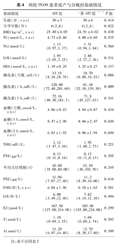 由表2可见AIT组患者的餐后1 h胰岛素水平高于非AIT组,P=0.028, AIT组患者A水平低于非AIT组,P<0.05,差异有统计学意义;而年龄、不孕年限、体质量指数(BMI)、血脂、血糖、TSH、游离甲状腺素(FT4)及其他性激素水平在两组间差异无统计学意义。