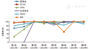 参评基层医疗机构梅毒的检测方法主要有酶联免疫吸附试验(ELISA)、胶体金法、梅毒螺旋体颗粒凝集试验(TPPA)、快速血浆反应素试验(RPR)、甲苯胺红不加热血清试验(TRUST)、化学发光免疫分析法等,对各方法在2011至2016年间的合格率和阴阳性符合率分别进行分析。6年间不同检测方法梅毒血清学检测结果的合格率不尽相同,胶体金法的合格率从2011年的67.78%升至98.89%;TPPA法的合格率从2011年的27.27%升至100%。梅毒螺旋体特异性检测方法和非梅毒螺旋体特异性抗体检测方法的阴阳性符合率变化较明显。TPPA法阴性符合率最低为9.09%,最高为100%,阳性符合率由54.55%升高到100%;TRUST法阴性符合率从78.95%升至100%,自2012年后每次波动在±10%以内。