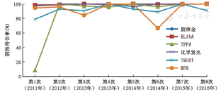 梅毒血清学检测方法主要包括梅毒螺旋体特异性抗体检测方法:酶联免疫吸附试验(ELISA)、胶体金法、梅毒螺旋体颗粒凝集试验(TPPA)、化学发光免疫分析法(CLIA);非梅毒螺旋体特异性抗体检测方法:快速血浆反应素试验(RPR)、甲苯胺红不加热血清试验(TRUST)。2011至2016年县级妇幼基层医疗机构8次室间质评中各检测方法合格率详细信息见表1。胶体金法的合格率从2011年的67.78%提升至2015年的98.90%,自2013年起合格率均在90%以上;TPPA法的合格率2011年仅为27.27%,自2014年第2次室间质评后合格率均为100%;ELISA和化学发光法的合格率相对稳定。非梅毒螺旋体特异性抗体检测方法中RPR方法合格率达到100%的次数大于TRUST法(图1)。