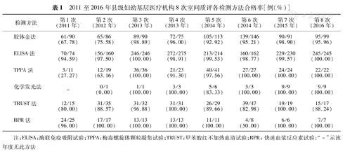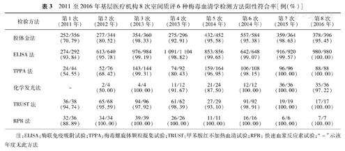 2011至2016年基层医疗机构8次室间质评6种梅毒血清学检测方法阳性符合率[例(%)]