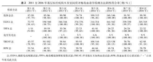 梅毒是由苍白密螺旋体的苍白亚种即梅毒螺旋体(TP)感染所引起的一种慢性、系统性长期发展的性传播疾病,具有较强传染性[1]。梅毒主要通过性接触传播,其次是母婴垂直传播或血液传播。孕妇一旦感染,可引起胎儿早产、死产或娩出先天梅毒儿[2]。梅毒血清学试验的孕前筛查是孕前优生项目基本服务内容之一。为监测基层实验室梅毒血清学检测的能力与水平,国家卫生计生委在全国范围内的县级基层医疗机构开展梅毒检测室间质量评价活动。现将2011至2016年8次梅毒血清学检测室间质评结果总结如下。