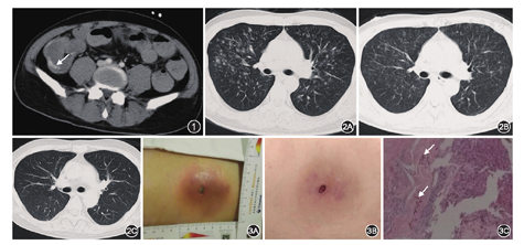 救治经过:入院后查血常规:白细胞(WBC)6.16×109/L,中性粒细胞(NEUT)5.10×109/L,血红蛋白(HGB)125 g/L,血小板256×109/L;大便潜血阳性;肝肾功正常,血白蛋白31 g/L;ESR 53 mm/h,hsCRP 89.02 mg/L;血淋巴细胞培养+干扰素测定(T.SPOT-TB):(-);腹盆增强CT:末段回肠、回盲部多发肠壁增厚伴异常强化;结肠镜:盲肠、升结肠多发深大溃疡,全结肠散在阿弗他样浅溃疡,病理学检查显示为结肠黏膜显急慢性炎,可见个别隐窝脓肿,局灶淋巴细胞聚集,未见抗酸杆菌。患者入院后仍有发热、腹痛症状,考虑白塞病、胃肠道受累明确,入院后予甲泼尼龙80 mg 1次/d静脉滴注,并间断静脉注射环磷酰胺。患者于2016年8月17日、9月22日出现2次上消化道大出血,予急诊胃镜钛夹止血治疗后好转。2016年8月19日起患者间断排暗红色血便,逐渐加重,2016年9月4日排鲜血便共1 000 ml,血红蛋白降至48 g/L,腹盆CT血管造影提示回盲部可见活动性出血(图1)。2016年9月5日凌晨急诊行右半结肠切除+远端回肠造口术,术后病理诊断:(右半结肠、小肠)黏膜显慢性炎,伴多发溃疡形成,肠壁小血管扩张及淤血,偶见小静脉炎,病变不除外结肠白塞病。术后患者症状一度好转,2016年9月24日患者再次出现腹痛加剧,腹膜刺激征阳性,经腹腔引流管引出黑褐色液体及气体。考虑消化道穿孔,急诊行剖腹探查+小肠部分切除+末端回肠造口+空肠营养管置入术,术后病理学诊断:(末端小肠)溃疡并穿孔,浆膜面显急性及慢性炎,纤维组织增生,断端黏膜显慢性炎。考虑患者白塞病控制不佳,多次消化道出血、穿孔,2016年10月12日、10月26日2次予英夫利西单抗300 mg静脉滴注。2016年10月16日经空肠营养管给予肠内营养1周后再次出现消化道穿孔合并腹腔感染(粪肠球菌、绿脓杆菌、鲍曼不动杆菌),予积极抗感染治疗及放射介入下2次行腹腔穿刺引流后感染逐渐控制。患者原发病趋于稳定,未再出现消化道出血,逐步过渡至经口进食,激素逐渐减量,因肝功能损害停用环磷酰胺,联合环孢素、硫唑嘌呤治疗。期间其他主要合并症如下:(1)肺部感染:患者入院初期发热、咳嗽、咳黄痰,合并低氧血症,CT示双肺多发斑片、结节影,抗细菌治疗效果不佳,考虑真菌及结核感染不除外,加用拜复乐、阿米卡星、异烟肼、乙胺丁醇等抗结核及伏立康唑抗真菌治疗后肺部情况好转(图2),后维持异烟肼联合乙胺丁醇抗结核治疗。(2)血流感染:2016年12月曾有1次PICC导管相关血流感染(大肠埃希菌、粪肠球菌、鲍曼不动杆菌)、感染性休克,予积极抗感染、抗休克支持治疗后好转。(3)胸壁软组织感染:2016年12月底患者右胸壁处擦伤后出现局部伤口破溃、不愈合,后出现红肿、疼痛,B超提示局部软组织混合回声,床旁接种局部脓液病原学无阳性提示,皮下坏死物质2次送病理学检查均可见真菌菌丝。予深部坏死组织清创换药,并加用口服伏立康唑,局部红肿疼痛情况好转(图3)。患者原发病平稳,复查ESR、hsCRP正常,恢复经口进食后于2017年2月21日出院。出院时用药:美卓乐(逐渐减量,目前至20 mg 1次/d)、环孢素(75 mg 2次/d,根据血药浓度调整剂量)、硫唑嘌呤(50 mg/100 mg 1次/d交替,后因白细胞减低停用)、沙利度胺(75 mg 1次/d),门诊规律随访中,目前病情尚稳定。