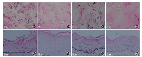 皮肤组织常规石蜡包埋切片与胶带粘贴法采集脱落角质层细胞[1],滴加氨银溶液孵育,氯化金溶液增色,伊红复染。脱水、透明和封片后,于Olympus正置显微镜下观察并拍照。载有脱落角质层细胞的玻片,观察前于玻片上滴加香柏油。使用Image-J图像分析软件(美国NIH免费版)计数角质层细胞内的平均黑素颗粒。