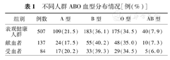 | 组别 | 例数 | A型 | B型 | O型 | AB型 |