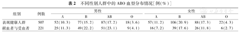 见表2 。由于献血者和受血者人群的血型分布差异无统计学意义,所以将两组数据合并。表观健康人群以及献血者和受血者中不同性别人群的ABO血型分布差异无统计学意义(χ2=2.244、1.920,均P>0.05)。