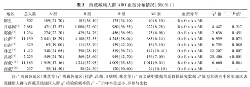 探究西藏阿里地区表观健康人群ABO血型分布情况,荟萃分析阿里地区藏族人群与西藏藏族人群血型分布差异。