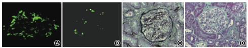 在床边彩超定位下,采用BARD公司的自动活检枪(16#)取出肾组织1~2条后,立即将获取的肾组织分割成数段,以同时进行光学显微镜、免疫荧光和电子显微镜检查。光镜检查包括苏木精-伊红(HE)染色、过碘酸Schiff(PAS)染色及Masson染色。免疫荧光染色项目包括IgA、IgG、IgM、C3、C1q、纤维蛋白相关抗原(FRA)和白蛋白(ALB)。因IgA肾病的病理损害多样化,既有肾小球固有细胞的改变,也有基底膜、内皮细胞及肾小管间质的病变,本研究主要以IgA同时伴有C3在移植肾系膜区的沉积和系膜增生为标准,其他伴随病变可有新月体形成、肾小球局灶节段硬化、系膜区电子致密物沉积、炎症细胞浸润等[7]。
