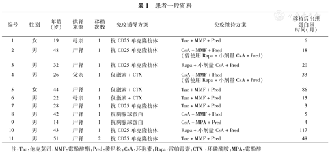 | 编号 | 性别 | 年龄(岁) | 供肾来源 | 移植次数 | 免疫诱导方案 | 免疫维持方案 | 移植后出现蛋白尿时间(月) |
