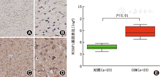 免疫组化染色结果显示,NUSAP1基因表达于细胞核内(图1A,图1B),在GBM中(图1C,图1D)表达较非肿瘤对照脑组织(图1A,图1B)增高。从23例原发GBM和23例对照组提取总RNA进行RT-PCR分析,与对照组相比,GBM组的NUSAP1的mRNA表达显著升高(图1E)。