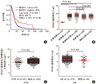 在美国癌症基因组图谱(TCGA)公共数据库中的GBM队列(n=528)[10],分析NUSAP1的表达数据和患者临床信息来验证NUSAP1的差异表达及其预后价值。通过该数据库数据,还可分析GBM常见基因的变异和分子亚型数据,可用于分析NUSAP1的表达及其与这些分子变异之间的相关性。