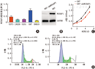 以RT-PCR和免疫组化技术分析NUSAP1在GBM手术标本的表达水平。在TCGA数据库中分析该基因表达与GBM患者分子分型、生存期的相关性。采用基因沉默技术封闭该基因在U87细胞表达,CCK-8实验检测细胞增殖,流式细胞术检测细胞周期变化,并行体内致瘤试验。