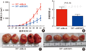 2×106转染NUSAP1基因的U87-shNUSAP1细胞或转染空载体的U87-shMock细胞分别接种于雄性Balb/c无胸腺裸小鼠右腋皮下,每组6只实验鼠,每周3次使用游标卡尺测量皮下移植瘤长度(l)和宽度(w),然后以公式(V =lw2/2)计算肿瘤体积。实验结束后解剖皮下肿瘤,测量瘤径并称重。