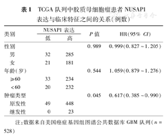 TCGA队列中胶质母细胞瘤患者NUSAP1表达与临床特征之间的关系(例数)
