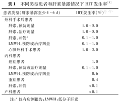 HIT发生的风险与肝素类药物的类型、肝素暴露时间、暴露方式(静脉/皮下使用、体外循环和各种体外装置、肝素冲管或封管等)、剂量及治疗策略、患者人群、全身性炎症、创伤程度以及性别等有关(表1)。此外,牛源性肝素高于猪源性肝素,治疗剂量可能高于预防剂量,接受UFH高于LMWH,外科患者高于内科患者,其中心外科手术和骨科大手术患者应用UFH时HIT风险(1%~5%)高于内科和产科患者(0.1%~1%),严重创伤接受外科大手术治疗患者HIT风险高于其他患者,女性患者高于男性患者。
