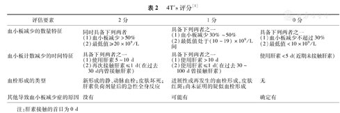 4T′s评分(4T′s HIT Score)是由血小板减少的数量特征(thrombocytopenia)、血小板减少的时间特征(timing of onset)、血栓形成类型(thrombosis),以及是否存在其他导致血小板减少的原因(other cause of thrombocytopenia)四个要素构成,四项评分相加,根据得分多少确定HIT的临床可能性:≤3分为低度、4~5分为中度和6~8分为高度临床可能性(表2)。