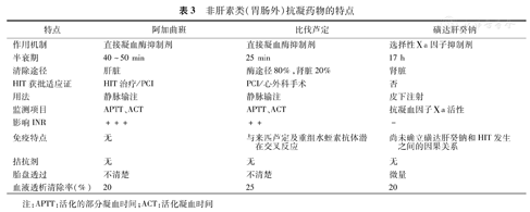 HIT治疗分为初始治疗阶段和维持治疗阶段。初始抗凝治疗药物主要是胃肠外给药的比伐芦定、阿加曲班和磺达肝癸钠(表3),LMWH不能用于HIT治疗。维持治疗多以华法林替代,个别情况下(如孕妇)可使用磺达肝癸钠。有多个小样本研究探讨使用新型口服抗凝药(NOAC)作为HIT的初始抗凝治疗和(或)维持用药[13]。