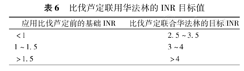 应用比伐芦定前常规测定基础INR水平,当病情稳定及血小板计数≥150×109/L或恢复至基线水平情况下,应逐渐过渡到使用华法林。华法林初始剂量2.5~3.0 mg/d,必须与比伐芦定重叠5 d以上,每日监测INR,INR符合要求(目标INR与基础INR水平相关,见表6),可停用比伐芦定,继续使用华法林。停比伐芦定4~6 h后再次监测INR和APTT:(1)若复测INR未达标,继续两种药物联合应用,24 h后复测;(2)若INR达标,且APTT≤40 s,继续华法林抗凝治疗;(3)若INR达标,且APTT>40 s,考虑比伐芦定药物代谢延长所致,4 h后复测INR和APTT。也可在转换为华法林之前,先从比伐芦定转换为磺达肝癸钠作为过渡(该药对INR影响小)。