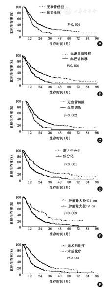 496例患者的中位随访时间为15个月,中位生存时间为15.9个月,1、3及5年累积生存率分别为63.7%,23.0%及17.0%。见表1。单因素分析中性别、肿瘤最大径、脉管及神经侵犯、胰周脂肪组织浸润、切缘情况、血管侵犯、淋巴结转移、TNM分期、血管切除、分化程度及术后有无化疗与预后相关。多因素分析:脉管侵犯、淋巴结转移、联合血管切除、肿瘤最大径>2 cm及低分化是预后差的独立危险因素,术后化疗是预后的有益因素。见表2。独立预后因素生存曲线图的比较(图1A,图1A,图1B,图1C,图1D,图1E,图1F)。