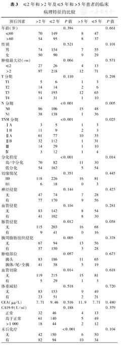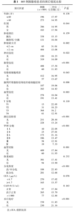 回顾性分析469例胰腺癌切除术后患者的预后因素,以2、5年为界比较临床病理特征。