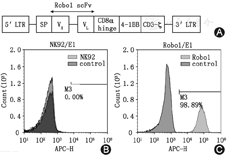 本实验构造的二代Robo1-CAR片段结构如图1A所示。流式细胞术检测结果(图1B,图1C)显示Robo1-CAR在Robo1-CAR-NK92细胞上阳性表达(阳性率为98.89%),而未转染NK92细胞为阴性表达。