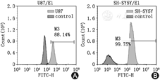 流式细胞术检测结果如图2A及图2B分别显示Robo1在U87-MG及SH-SY5Y细胞均为阳性表达,阳性率分别为88.14%和99.75%。上述结果显示,Robo1在SH-SY5Y细胞的表达水平稍高于在U87-MG细胞的表达水平。