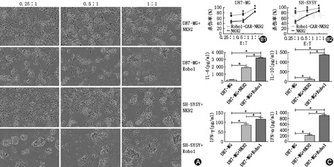 如图3B1,图3B2所示,Robo1-CAR-NK92细胞对SH-SY5Y细胞的杀伤效率为(82.335±5.512)% (0.25∶1)、(88.607±6.106)% (0.5∶1)及(97.440±1.474)% (1∶1),而NK92细胞对SH-SY5Y的杀伤效率为(45.954±5.938)%(0.25∶1)、(70.370±2.030)% (0.5∶1)及(87.230±2.820)% (1∶1)。Robo1-CAR-NK92细胞对U87-MG细胞的杀伤效率分别为(69.227±2.818)%(0.25∶1)、(74.573±3.575)% (0.5∶1)及(95.651±2.395)% (1∶1)而NK92细胞对U87-MG细胞的杀伤效率为(46.042±5.732)% (0.25∶1)、(49.780±6.328)% (0.5∶1)及(84.486±2.591)% (1∶1)。Robo1-CAR-NK92细胞对两种靶细胞的杀伤活性均显著强于NK92细胞,并且差异有统计学意义(P<0.05)。在不同的效靶比下,Robo1-CAR-NK92细胞对SH-SY5Y细胞的杀伤效率均强于对U87-MG细胞,差异有统计学意义(P<0.05)。NK92和Robo1-CAR-NK92细胞对U87-MG和SH-SY5Y细胞的杀伤率随效靶比的增加而增加,呈剂量依赖性。如图3A所示,相位照片同样印证了上述结果。另外,如图3C所示,Robo1-CAR-NK92细胞在杀伤U87-MG过程中分泌的IL-6、IL-10、TNF-α和IFN-γ较NK92细胞显著增加,更显著大于U87-MG细胞对照组,差异均有统计学意义(均P<0.05)。IL-2、IL-4和IL-17A未检测到。以上数据显示,Robo1-CAR-NK92细胞比NK92细胞有更强的功能。