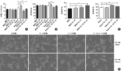 如图4A和图4B所示,与未经处理的NK92细胞相比,IL-15和(或)IL-21的处理对NK92细胞的增殖、活性无明显影响(P>0.05),与未经处理的Robo1-CAR-NK92细胞相比,IL-15处理的的细胞数目(×104/ml)和活性率分别从(14.66±0.05)和(89.22±1.12)%上升至(17.33±0.31)和(94.22±0.60)%(P<0.05),而IL-21处理的Robo1-CAR-NK92细胞急剧下降至(10.49±0.53)和(77.18±1.53)%(P<0.05),二者联用后下降至(13.03±0.25)(P<0.05)和(86.59±1.48)%(P>0.05)。如图4C所示,与未经处理的NK92和Robo1-CAR-NK92细胞相比,IL-21处理的NK92和Robo1-CAR-NK92细胞对U87-MG细胞的杀伤率分别从(49.51±1.36)%和(76.48±1.10)%增加至(55.97±2.67)%和(91.62±0.49)%(P<0.05),而IL-15的处理对二者的杀伤率无明显影响(P>0.05),二者联用后分别增加至(65.73±3.19)%和(83.46±1.74)%(P<0.05)。如图4D所示,相位照片同样印证了上述结果。