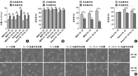 如图5A,图5B所示,与仅用IL处理的NK92和Robo1-CAR-NK92细胞相比,加用地塞米松处理的NK92和Robo1-CAR-NK92细胞数目和活性率显著升高(P<0.05)。而如图5C所示,与仅用白介素处理的NK92和Robo1-CAR-NK92细胞相比,加用地塞米松处理的NK92和Robo1-CAR-NK92细胞对U87-MG细胞的杀伤率显著降低(P<0.05),除地塞米松联用IL-15处理的Robo1-CAR-NK92细胞对U87-MG细胞的杀伤率未见明显变化(P>0.05)。如图5D所示,相位照片同样印证了上述结果。