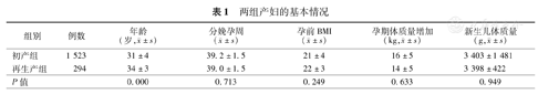 | 初产组 | 1 523 | 31±4 | 39.2±1.5 | 21±4 | 16±5 | 3 403±1 481 |